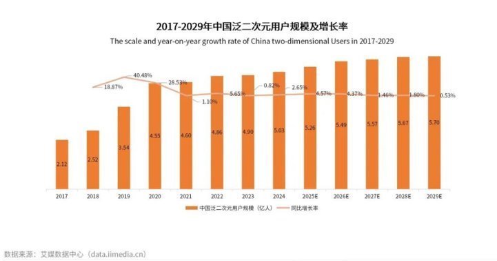艾媒商讨统计数据涌现,2019年中国泛二次元用户限制3.54亿东谈主,2024年达5.03亿东谈主,计算2029年将达5.70亿东谈主;2019年中国泛二次元及相近市集限制2983亿元,2024年则赶紧擢升至5977亿元,2029年则有望达到8344亿元,成为各人泛二次元成长最快的市集。
